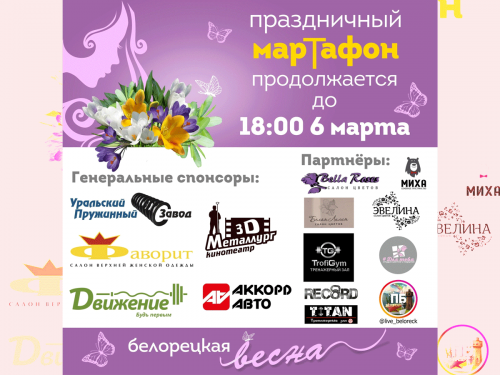 С 26 февраля по 6 марта в нашем городе проходил МарТафон «Белорецкая весна» вместе с самым веселым дуэтом Белорецка – KZ! Спонсоры нашего города с радостью поддержали эту идею и приняли активное участие в мероприятии.