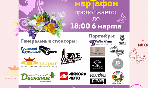 С 26 февраля по 6 марта в нашем городе проходил МарТафон «Белорецкая весна» вместе с самым веселым дуэтом Белорецка – KZ! Спонсоры нашего города с радостью поддержали эту идею и приняли активное участие в мероприятии. Наша компания, «Аккорд-авто», так же не осталась в стороне, став генеральными спонсорами этого праздника. Участницы МарТафона размещали свои фотографии и видео на своих страницах в социальных сетях с хештегами:
